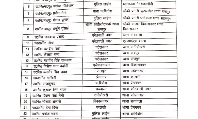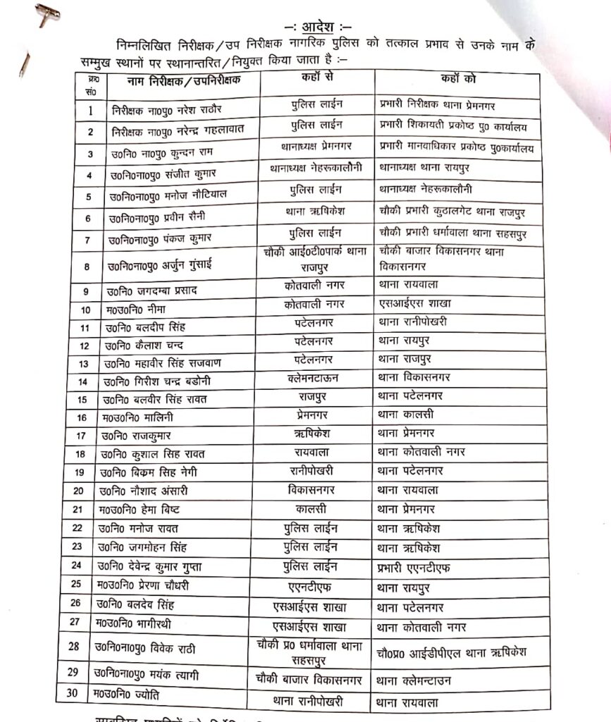 राजधानी देहरादून में एसएसपी प्रमेंद्र डोभाल ने किए 2 इंस्पेक्टर सहित 30 के ट्रांसफर।।