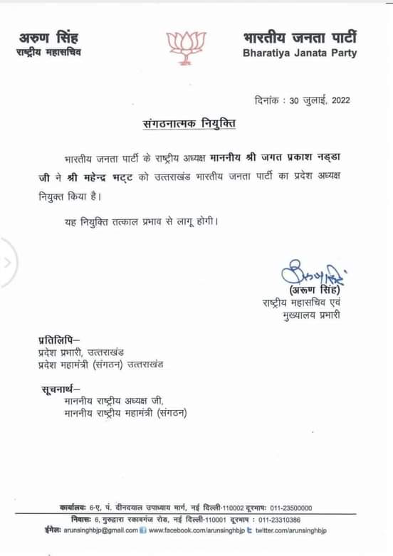 महेंद्र भटट को सौंपी गई भाजपा प्रदेश अध्यक्ष की बड़ी जिम्मेदारी