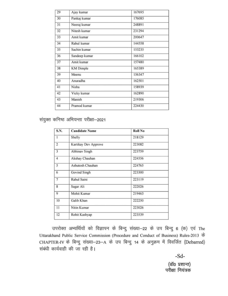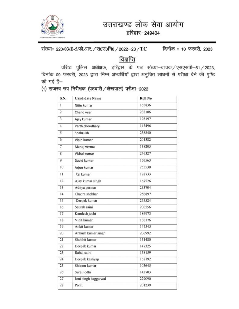: उत्तराखंड लोक सेवा आयोग ने पटवारी लेखपाल व संयुक्त कनिष्ठ अभियंता के पेपर में नकल करने वाले अभ्यर्थियों की लिस्ट जारी कर दी है। इसमें पटवारी व लेखपाल के 44 अभ्यर्थी हैं..जिसमें सयुक्त कनिष्ठ अभियंता परीक्षा 2021 भर्ती के अभ्यर्थी शामिल है… 2022 में आयोजित पटवारी लेखपाल की परीक्षा में 563 पदों पर भर्तियां की गई थी..पेपर के कुछ समय बाद ही पटवारी लेखपाल की परीक्षा में नकल की बात सामने आई थी जिसकी निष्पक्ष जांच चल रही है और उसमें संलिप्त आरोपियों की अरेस्टिंग भी की जा रही है